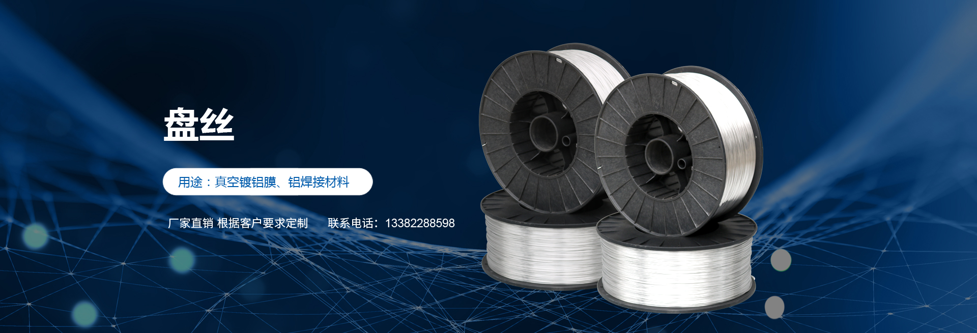 高純度鋁絲:公司主打產品。SGS認證產品,適用于真空鍍鋁。純度99.9%。可為客戶量身定做生產的各盤裝鋁絲、鋁直條。產品應用領域十分廣泛,如:真空鍍鋁膜、電器儀表、電子、家電業、電線電纜業、建筑裝飾業、五金裝飾業、IT電腦業、廣告裝飾業、醫療器械、工藝制品、防腐制品(大型港口、橋梁、碼頭)、食品包裝容器、紡織服裝等。